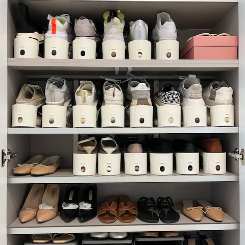이것은 일반 여성용 단화, 신발에 맞는 신발 정리대입니다.일반 운동화는 힘듭니다.이것은 높낮이 조절이 가능했습니다얘는 운동화도 할 수 있는 크기인데 높이 조절이 안 돼서 일단 두 켤레만 구입해 봤다미끄럼방지 패드가 있어서 위 사진처럼 신발이 흘러내리지 않게 꽂을 수 있어서 이게 마음에 들어요윗칸에는 신발 한 켤레밖에 놓여있지 않은 상황 ㅋㅋㅋ 다른 한칸은 다른칸에 있어서 정리가 필요해요헤헤 신발정리대를 놓았더니 깔끔하게 2켤레를 넣을 수 있었습니다.그리고 위 칸을 정리하고 싶었어요!짠! 나머지 3개 신발 정리대로 정리 완료!총 4켤레가 들어있었는데 신발 정리대에서 한 켤레 더 넣을 수 있었어요!신발장 공간이 부족하신 분들은 신발정리대를 정말 추천드려요!!!신발 안신는건 버려야하는데 신을것같아서 일단 정리만 하기로 ㅋㅋ 일단 정리대를 사보고 크기가 안맞으면 다른사이즈로 사보려고 했는데 흰색은 여성용 단화나 신발에 잘맞고 회색은 일반사이즈 신발에도 잘맞더라구요!~(그래도 사이즈 비교 꼭 해보세요!) 또 회색은 높이조절이 안되서 걱정했는데 저희 신발장에 잘맞아서 다행이에요. 🙂 몇개 더 구입해서 운동화도 정리하려고요~!만족스러운 다이소 슈즈 정리대 리뷰 종료 ★짠! 나머지 3개 신발 정리대로 정리 완료!총 4켤레가 들어있었는데 신발 정리대에서 한 켤레 더 넣을 수 있었어요!신발장 공간이 부족하신 분들은 신발정리대를 정말 추천드려요!!!신발 안신는건 버려야하는데 신을것같아서 일단 정리만 하기로 ㅋㅋ 일단 정리대를 사보고 크기가 안맞으면 다른사이즈로 사보려고 했는데 흰색은 여성용 단화나 신발에 잘맞고 회색은 일반사이즈 신발에도 잘맞더라구요!~(그래도 사이즈 비교 꼭 해보세요!) 또 회색은 높이조절이 안되서 걱정했는데 저희 신발장에 잘맞아서 다행이에요. 🙂 몇개 더 구입해서 운동화도 정리하려고요~!만족스러운 다이소 슈즈 정리대 리뷰 종료 ★