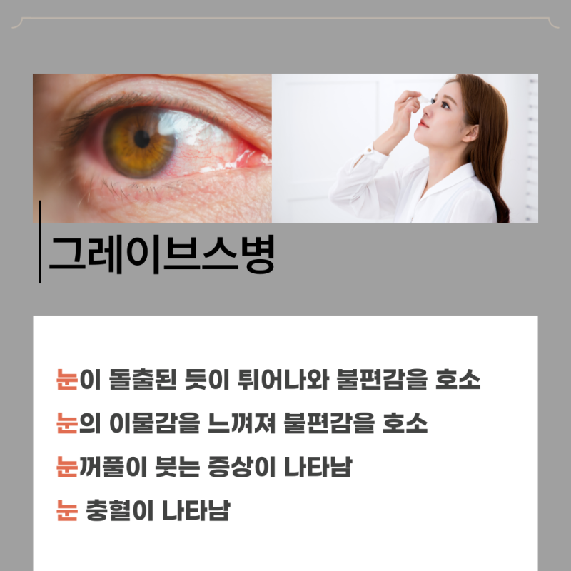 - 몸의 대사가 과잉되어 에너지를 소모시키기 때문에 피로감과 체중 감소를 일으킵니다. 겉보기에는 눈이 앞으로 튀어나와 갑상선 부위가 커지는 현상이 눈에 띕니다. 혈압 이상, 숨이 차는 증상, 신경질로 감정 변화가 심해지거나 불안감, 불면증이 나타날 수 있으며 특히 더위를 견디기 어렵고 땀을 많이 흘리기 때문에 여름철에는 견디기 어렵습니다.