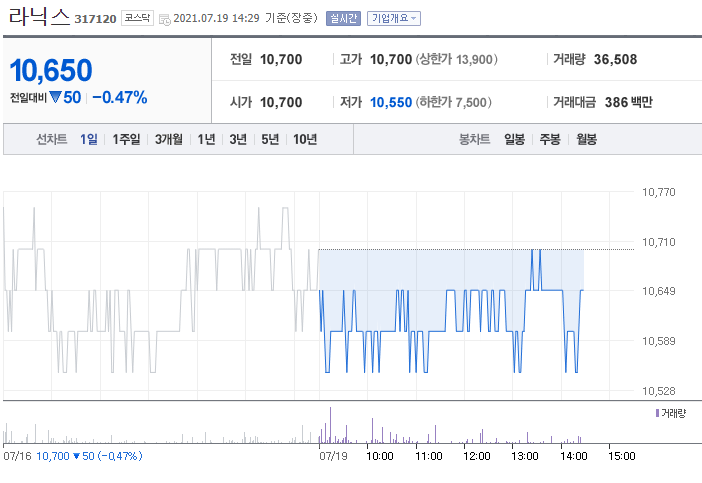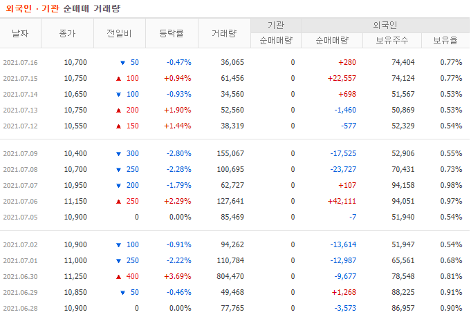 전날에는 10,700원에 마감했고 오늘 시가 10,700원에 출발해서