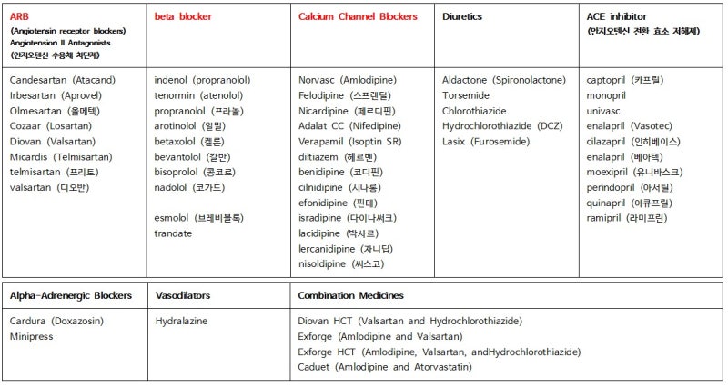 고혈압약물은 #알파블로커 #베타블로커 #칼슘채널차단제 #ACE차단제 #ARB차단제 #이뇨제로 분류할 수 있습니다.