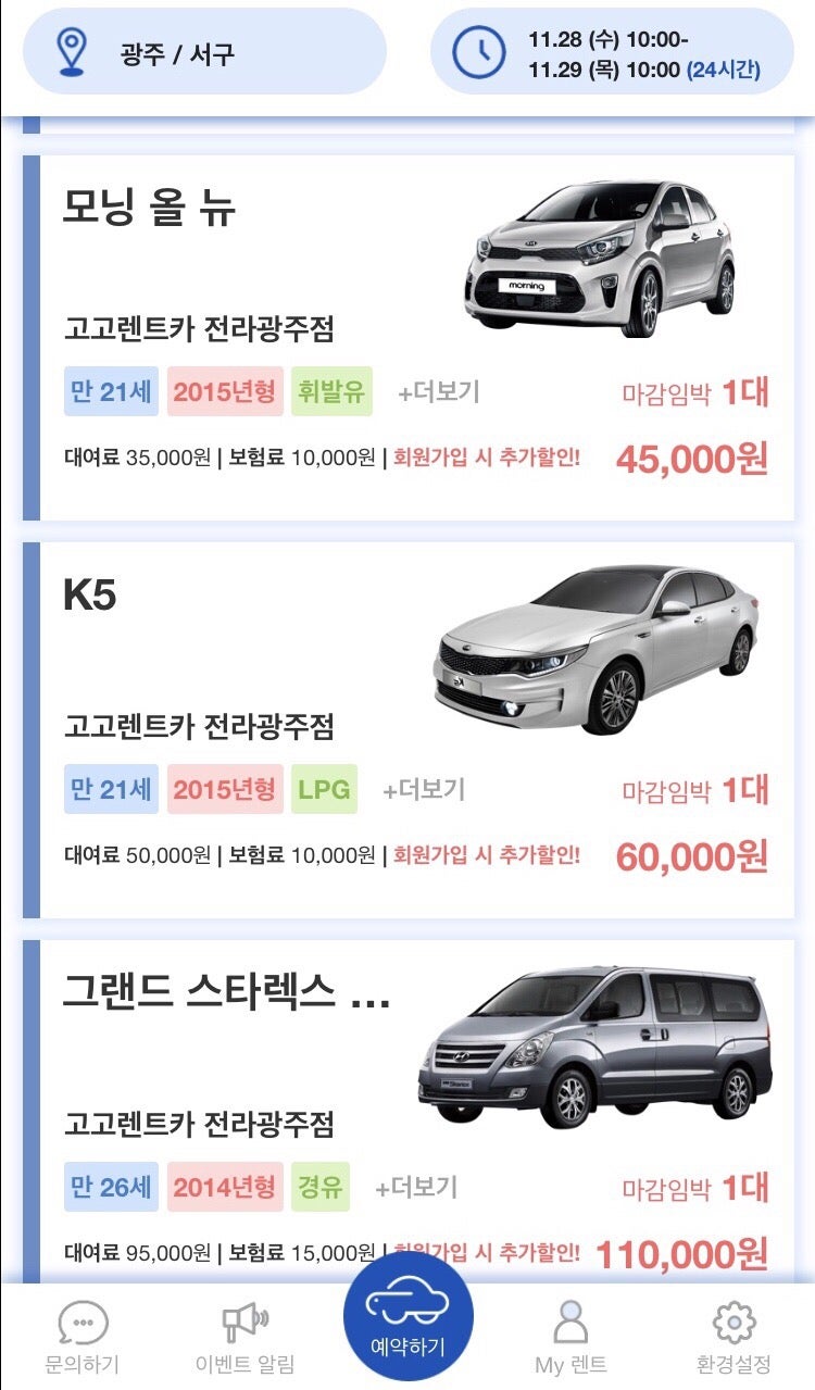 안녕하세요 광주공항렌트카 대여를 전문적으로 하고 있는 광주렌트카입니다.셀프렌트, 승용차, 대형승용차, 수입차, 카니발, 스타렉스터 지역 방문 시 사전 예약을 받고 있습니다. 접속 예약을 해주시면 보다 신속하게 배달 서비스를 도와드리겠습니다.비흡연차량(사전예약해주세요) 예약필수!) 타이어상태 AAA와이퍼상태 AA++ 기본정비 GOOD 하단사진 클릭하시면 바로 전화가능합니다.▼▼