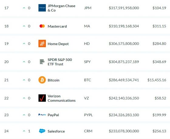 출처 : AssetDash에셋대시가 주식, 상장지수펀드(ETF), 암호화폐 3가지 자산의 시가총액을 조사해 작성한 목록에서 비트코인은 현재 21위에 올라 있으며 톱20 진입이 가능할 것으로 보인다.
