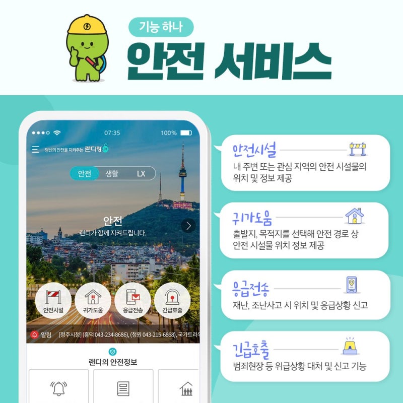 저도 만약을 위해 제 위치정보를 바탕으로 CCTV, 경찰서, 병원, 약국, 버스정류장을 선택해두면 쉽게 찾을 수 있고 혹시라도 위급상황이 발생할 경우 SOS기관에 메시지도 전달할 수 있는 기능이 있어요! 아무래도 저희 집 근처가 산 쪽이라 올라오다가 위험상황이 발생할까 항상 걱정했는데 랜디와 앱이 있어서 안심귀가 및 편리한 기능이 많네요~