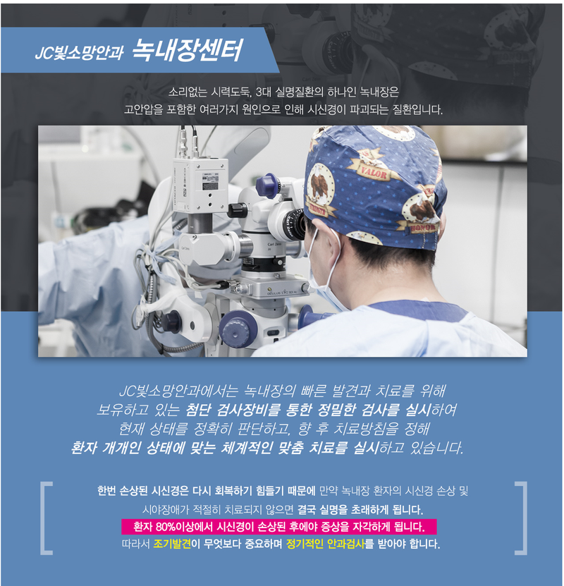 서울대 출신 녹내장 전문 의료진이 상주하는 SNU 청안과는 신속하게 질병을 발견하고 진행을 막을 수 있도록 원데이 시스템을 도입했습니다. 각종 검사부터 진단까지 하루 만에 모두 가능하며, 검사 결과 및 상담을 바탕으로 일대일 녹내장 치료 방법을 제시합니다. 조기 발견이 가장 좋은 질환인 만큼 정기적인 검사와 신속한 대처의 중요성을 잊지 마시기 바랍니다.