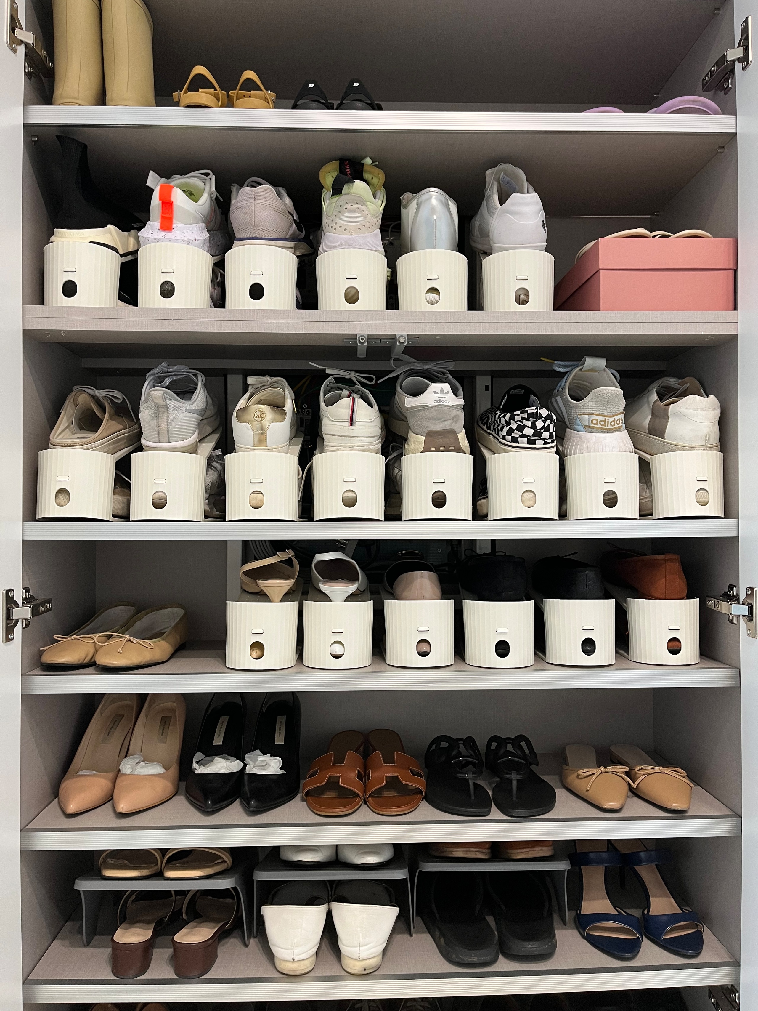이것은 일반 여성용 단화, 신발에 맞는 신발 정리대입니다.일반 운동화는 힘듭니다.이것은 높낮이 조절이 가능했습니다얘는 운동화도 할 수 있는 크기인데 높이 조절이 안 돼서 일단 두 켤레만 구입해 봤다미끄럼방지 패드가 있어서 위 사진처럼 신발이 흘러내리지 않게 꽂을 수 있어서 이게 마음에 들어요윗칸에는 신발 한 켤레밖에 놓여있지 않은 상황 ㅋㅋㅋ 다른 한칸은 다른칸에 있어서 정리가 필요해요헤헤 신발정리대를 놓았더니 깔끔하게 2켤레를 넣을 수 있었습니다.그리고 위 칸을 정리하고 싶었어요!짠! 나머지 3개 신발 정리대로 정리 완료!총 4켤레가 들어있었는데 신발 정리대에서 한 켤레 더 넣을 수 있었어요!신발장 공간이 부족하신 분들은 신발정리대를 정말 추천드려요!!!신발 안신는건 버려야하는데 신을것같아서 일단 정리만 하기로 ㅋㅋ 일단 정리대를 사보고 크기가 안맞으면 다른사이즈로 사보려고 했는데 흰색은 여성용 단화나 신발에 잘맞고 회색은 일반사이즈 신발에도 잘맞더라구요!~(그래도 사이즈 비교 꼭 해보세요!) 또 회색은 높이조절이 안되서 걱정했는데 저희 신발장에 잘맞아서 다행이에요. 🙂 몇개 더 구입해서 운동화도 정리하려고요~!만족스러운 다이소 슈즈 정리대 리뷰 종료 ★짠! 나머지 3개 신발 정리대로 정리 완료!총 4켤레가 들어있었는데 신발 정리대에서 한 켤레 더 넣을 수 있었어요!신발장 공간이 부족하신 분들은 신발정리대를 정말 추천드려요!!!신발 안신는건 버려야하는데 신을것같아서 일단 정리만 하기로 ㅋㅋ 일단 정리대를 사보고 크기가 안맞으면 다른사이즈로 사보려고 했는데 흰색은 여성용 단화나 신발에 잘맞고 회색은 일반사이즈 신발에도 잘맞더라구요!~(그래도 사이즈 비교 꼭 해보세요!) 또 회색은 높이조절이 안되서 걱정했는데 저희 신발장에 잘맞아서 다행이에요. 🙂 몇개 더 구입해서 운동화도 정리하려고요~!만족스러운 다이소 슈즈 정리대 리뷰 종료 ★