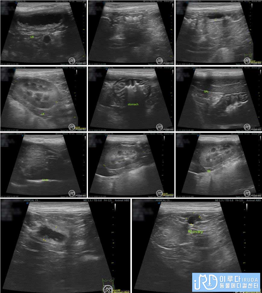복부 초음파를 통해 살펴본 결과, 장 내에 있는 다수의 가스가 확인되었습니다. 또한 간, 신장, 방광 등의 장기에는 문제가 없었지만 자궁의 크기가 비대하다는 것을 확인할 수 있었습니다. 방사선 검사와 복부 초음파를 통해 확인한 결과, ㅂㅇ는 자궁 수종과 장염으로 진단되었습니다.
