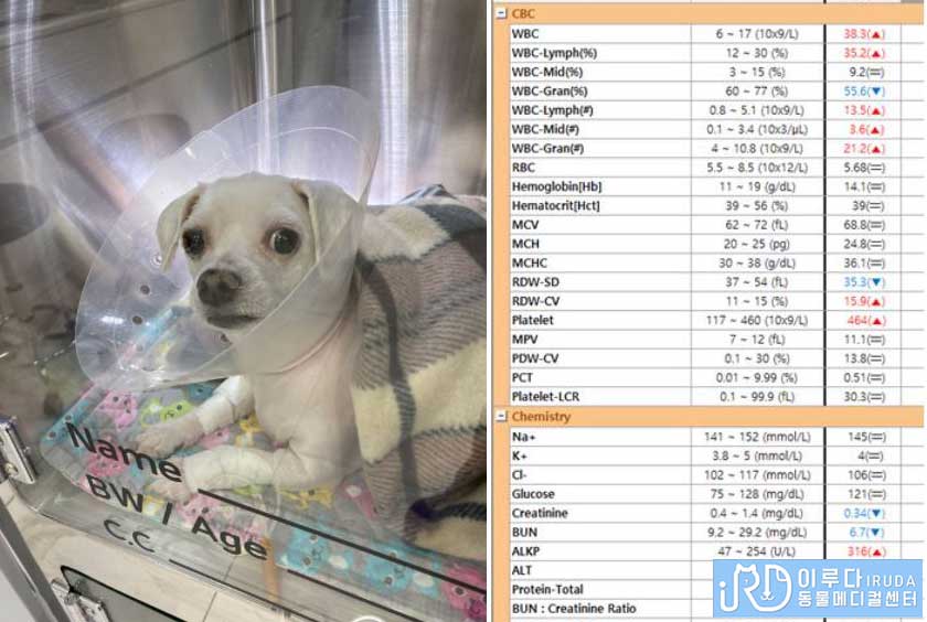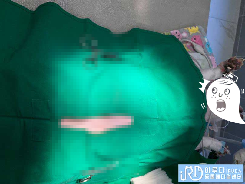 2일간 입원치료를 한 결과 설사, 혈변이 멈추고 수술을 진행할 수 있었습니다. 고령의 강아지의 경우 마취에 대한 부담이 있어 수술 전 혈액 검사를 해 주었습니다. 혈액 검사 결과 염증 수치가 높고, 간의 수치도 정상치 이상이었지만, 다행히 마취는 할 수 있는 상태였습니다.호흡 마취 및 수술