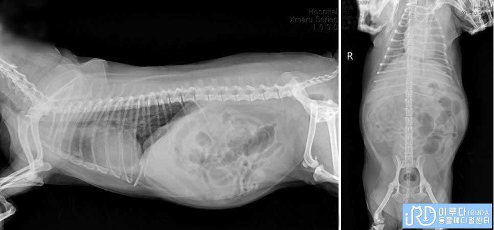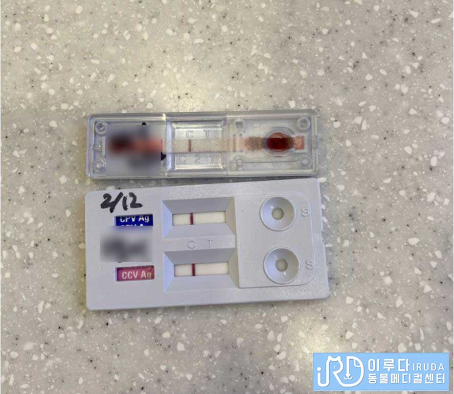 혈변의 경우 바이러스 또는 기생충 감염을 배제할 수 없으므로 심장사상충검사, 전염성 장염검사를 실시하였습니다. 개 심장사상충의 경우 사상충 키트로 검사할 수 있으며, 바이러스성 장염은 퍼보(CPV)와 코로나(CCV) 감염 여부를 동시에 검사할 수 있는 진단 키트를 사용합니다. 검사를 한 결과 심장 사상충과 바이러스는 음성으로 확인이 되었습니다.방사선 검사 및 복부 초음파 검사