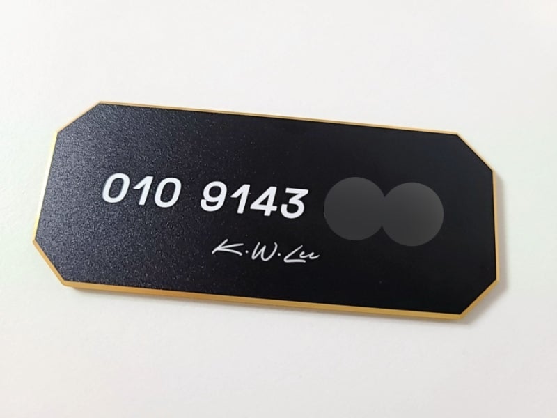 알루미늄 금속을 깎아 깎고 그 위에 레이저로 정교하게 각인했다.숫자를 몇 개 준비해서 필요한 것만 떼어내 붙이는 불특정 다수를 위한 것이 아니라 처음부터 끝까지 오로지 자신만을 위해 제작된 것이라고 생각하니 더욱 특별하게 느껴진다.1판에 전화번호 2개를 새기는 듀얼 각인도 가능하지만 이미 사용 중인 신랑 것은 따로 있어 KAY KIM 내 영문명을 새겼다.^^