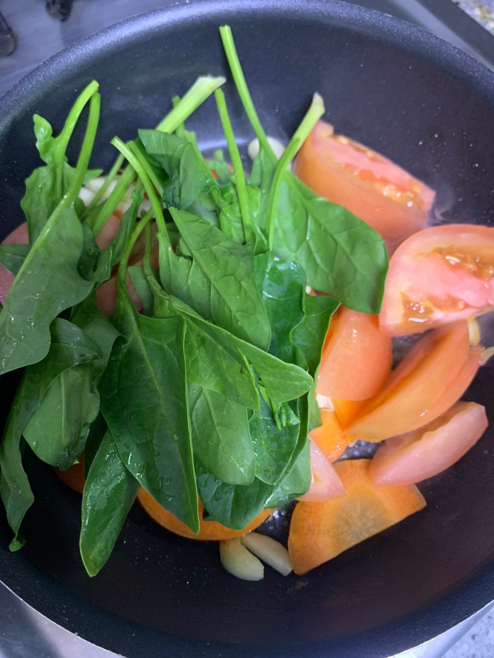 4차로 토마토와 시금치를 넣고 볶는다쉿쉿~