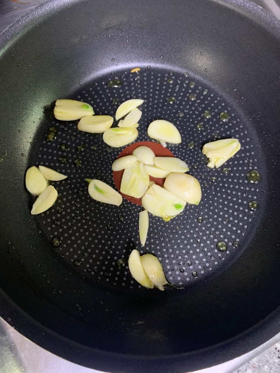 닭안심을 구운 후 프라이팬에 남은 기름을 키친타올로 닦은 뒤 새로 올리브유를 두르고 마늘을 볶는다.