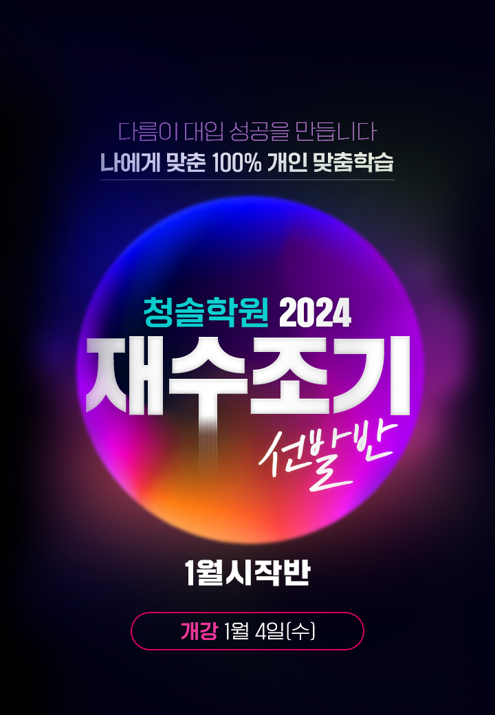 네~ 이렇게 분당청솔학원 재원생 전용 콘텐츠를 알아봤는데요:-) 킬러질문 콘텐츠 실전감각 콘텐츠 특화 콘텐츠 데일리 콘텐츠 다양한데 꼭 필요한 것만 모아서 구성한 학습 콘텐츠! 분당청솔학원에서 만나보실 수 있습니다.~후회없는 1년을 위해 함께 준비한 분당청솔학원에서 재수를 시작하여 기반을 다져보세요! 2월 1일 개강프리정규반에서 만나요~ 2021년 2월 1일 개강분당 입시학원, 분당청솔학원프리정규반에 대한 자세한 내용은 아래 사진을 클릭하시면 홈페이지로 이동하여 자세한 모집요강과 학습프로그램을 보실 수 있습니다~