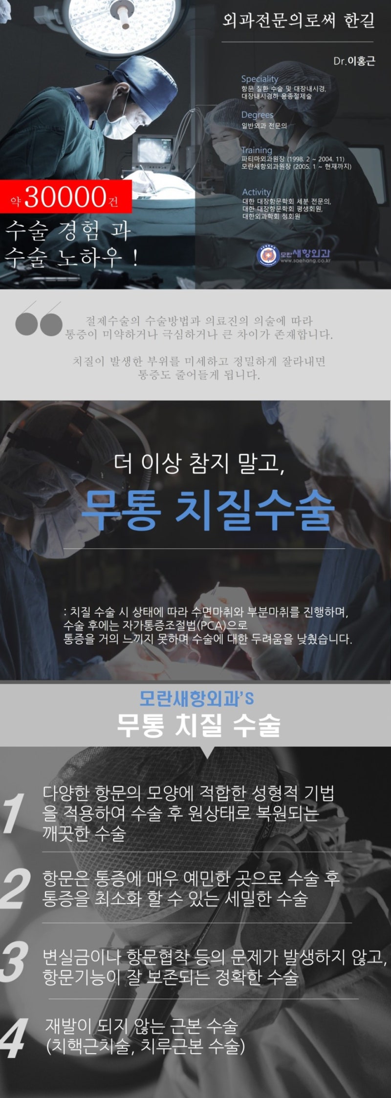 수술은 인공막 수술과 무인모공 수술로 진행되지만 인공막 수술은 인체에 무해한 인공조직을 활용하는 수술입니다. 그러나 간혹 거부반응이나 감염반응을 보이는 사람이 있습니다. 이런 분들은 자가조직을 활용하는 수술인 무인모공 탈장수술을 권하고 있습니다.분당항문외과 의료진과 면밀한 상담을 통해 본인에게 적합한 수술을 받을 것을 권장합니다. 수술은 국소 마취로 이루어지기 때문에 환자의 신체 부담이 적고 빠른 회복이 가능합니다.