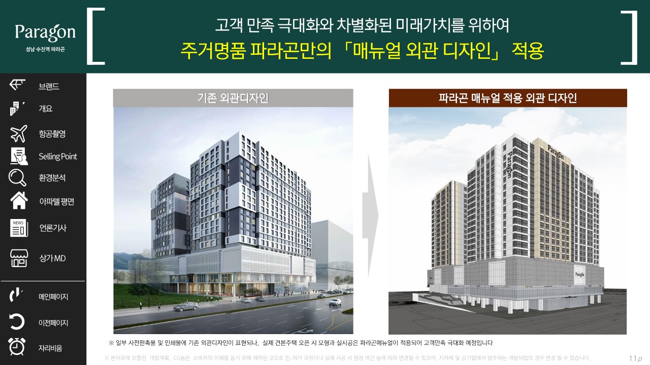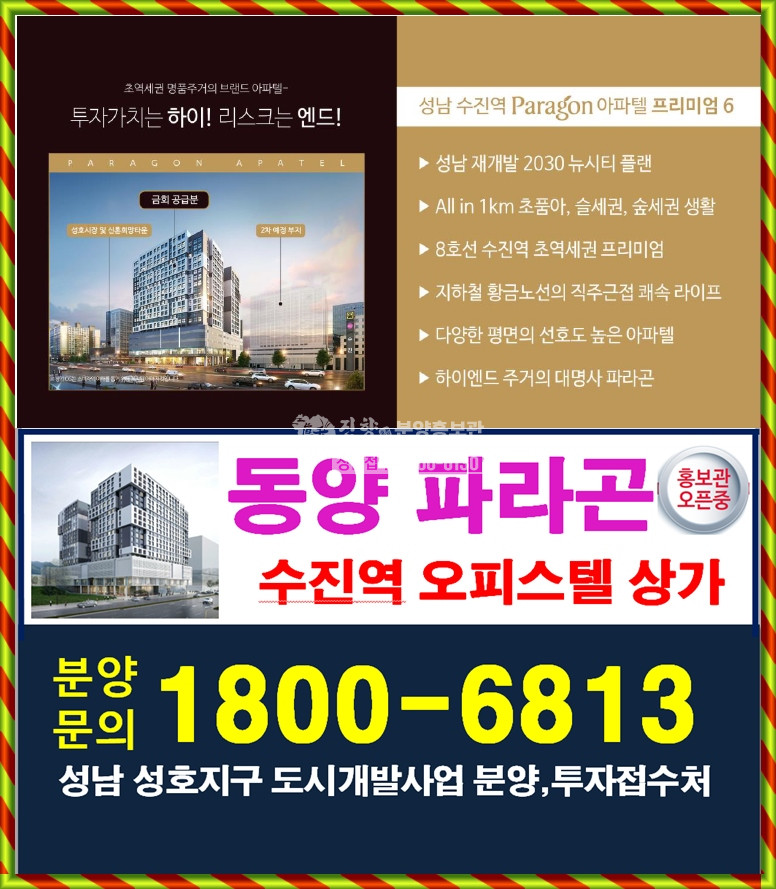 각 호실마다 세면대와 변기가 나뉘어 만들어지며 깨끗하고 사용하기 쉬운 프리미엄 화장실이 사용됩니다. 이 밖에도 거실 창문에는 외풍과 소음을 효율적으로 차단하는 이중 로이 요리가 설치됩니다.파라곤 브랜드의 오피스텔 및 상업시설로 주상복합 형태로 건설되는 현장이지만 역대급 프리미엄 신화를 자랑하는 곳으로 높은 청약률과 완판 신화로 입증된 브랜드 가치를 누리고 있습니다.2022년 시공능력평가에서 45위를 차지한 라인건설의 시공력과 동양건설산업의 기술력이 그대로 적용되는 곳으로 각종 상을 수상한 우수한 기술력이 적용됩니다.사업지는 8호선 수진역 초역세권의 가치를 누리지만 역세권 아파텔의 높은 가치를 여유로운 씨티라이프 특권을 가지고 있습니다. 지하철 황금노선 직주근접 쾌속 라이프를 가까이서 누립니다.성남 수진역 파라곤은 위례와 판교, 그리고 분당까지 10분대로 이동하고 송파 20분대로 강남까지 30분대로 이동하는 장점이 있습니다. 편리한 출퇴근으로 8호선 연장 사업이 개통되면 판교까지 10분대로 이동하게 됩니다.다양한 평면의 선호도가 높은 아파텔로 최근 주거 트렌드에 맞춰 다양하게 구성된 아파트의 대체 상품성을 가지고 있습니다. 이미 청담과 논현, 세종, 미사에서 가격 상승을 이루면서 성공적인 투자처로 각광받고 있는 브랜드 파워를 이어받게 될 곳으로 성남의 주거 명작이 될 것입니다.본 현장은 상업시설을 분양받아 상가를 통한 효율적인 투자를 하기에도 좋은 곳이지만 아파텔 570실의 고정수요를 확보하게 되어 독점상가로서 안정적인 매출이 가능해집니다. 산성대로와 수진역 주변의 풍부한 수요를 누릴 수 있는 곳으로 먹거리 골목의 유동 인구가 하루에 약 10만 명이 몰리게 되고 지하 2층 중앙 지하 상가와 직통 연결되어 이용객이 자연스럽게 유입됩니다.약 70m나 되는 산성대로변에 위치한 스트리트 상가로 상권 형성에 유리하며, 2차 사업지 완공 시 상호시장까지 이어지는 중아 보행로가 설치되어 대형 스트리트 매장으로 안정적인 고객 유입이 예상됩니다.사업지 내부에는 에스컬레이터를 설치하여 지하철역을 직통으로 연결하는 곳으로 지하 2층에서 지상 2층까지 편하게 오르내릴 수 있는 연결성을 가지고 있습니다. 고객 편의성은 물론 안정적인 고객 유치가 가능하고 소외되는 상가가 없는 곳에 투자하기 좋습니다.철저한 상권 분석과 고객 니즈를 충족시키는 MD 구성을 하는 장소로서 지하 상권 및 소비 패턴을 분석합니다. 특히 월라밸의 가치와 가성비를 추구하는 현대인의 니즈에 맞는 매장으로 만들어져 일상의 휴식과 외식, 쇼핑을 즐기는 상업시설이 되겠습니다.철저한 상권 분석과 고객 니즈를 충족시키는 MD 구성을 하는 장소로서 지하 상권 및 소비 패턴을 분석합니다. 특히 월라밸의 가치와 가성비를 추구하는 현대인의 니즈에 맞는 매장으로 만들어져 일상의 휴식과 외식, 쇼핑을 즐기는 상업시설이 되겠습니다.성남 수진역 파라곤은 상권 활력 재생과 성장 기업 활성화, 그리고 지역 특화 문화 재생, 스마트 도시 재생 사업 등 지역 개발 사업의 중심에 있습니다. 상생과 성장, 소통을 바탕으로 성남시가 주관하는 거대한 개발사업 수혜지가 되어 더 많은 사람들이 자연스럽게 모이게 됩니다. 성호시장과 중앙성궁광장의 연계공간과 프롬나드문화광장, 스마트에듀파크와 연결되는 곳으로 공실걱정이 없는 장점이 있는 현장입니다.성남 수진역 파라곤은 상권 활력 재생과 성장 기업 활성화, 그리고 지역 특화 문화 재생, 스마트 도시 재생 사업 등 지역 개발 사업의 중심에 있습니다. 상생과 성장, 소통을 바탕으로 성남시가 주관하는 거대한 개발사업 수혜지가 되어 더 많은 사람들이 자연스럽게 모이게 됩니다. 성호시장과 중앙성궁광장의 연계공간과 프롬나드문화광장, 스마트에듀파크와 연결되는 곳으로 공실걱정이 없는 장점이 있는 현장입니다.성남 수진역 파라곤은 상권 활력 재생과 성장 기업 활성화, 그리고 지역 특화 문화 재생, 스마트 도시 재생 사업 등 지역 개발 사업의 중심에 있습니다. 상생과 성장, 소통을 바탕으로 성남시가 주관하는 거대한 개발사업 수혜지가 되어 더 많은 사람들이 자연스럽게 모이게 됩니다. 성호시장과 중앙성궁광장의 연계공간과 프롬나드문화광장, 스마트에듀파크와 연결되는 곳으로 공실걱정이 없는 장점이 있는 현장입니다.