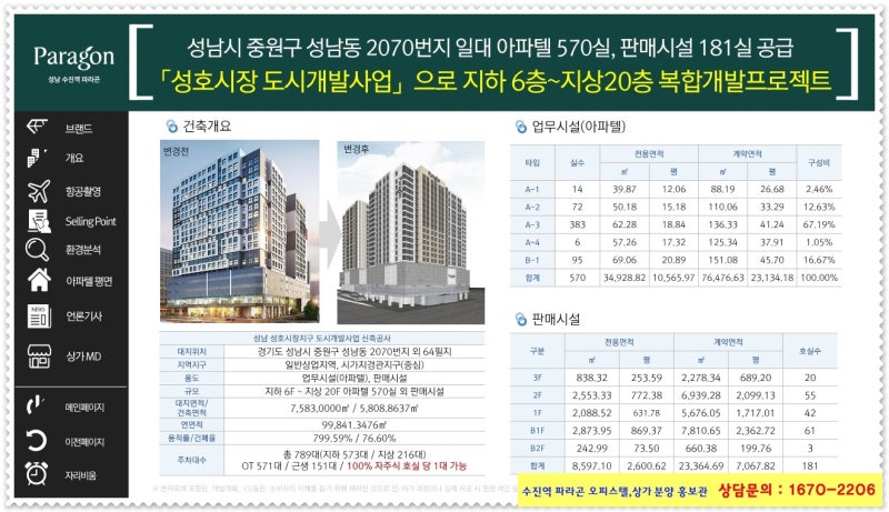 성남 수진역 파라곤은 옛 선호시장 도시개발사업으로 공급되는 현장인데, 1.5룸이 14실, 2룸이 461실, 3룸이 95실 공급되는 곳으로 총 570호실의 주거용 오피스텔로 아파텔이 마련됩니다.