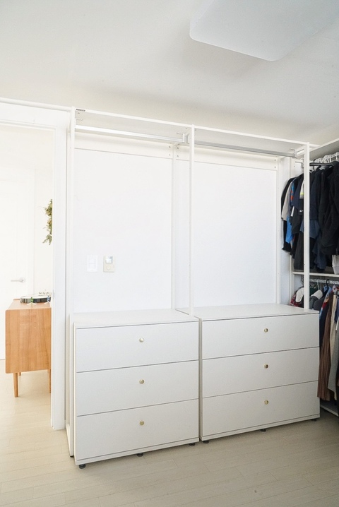 아이들 키에 맞게 너무 큰 서랍 대신 3단 정도의 것을 고르고 이에 맞는 의자를 배치해주세요. 그리고 선반 대신 타공판을 연결하여 연필통이나 다른 소품을 걸어 수납해도 좋아요.