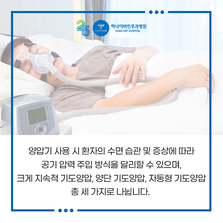 수면무호흡증은 수면다원검사 결과에 따라 경도, 중등도, 중증으로 구분되며 정도와 상기도 상태에 따라 수술, 양압기, 구강내 장치 치료 방법이 있습니다. 이 중 중증 수면 무호흡증은 대부분 양압기로 치료합니다. 무호흡증이 심한 만큼 기도가 막혀 있고 상기도 일부가 문제가 되는 것이 아니라 복합적인 원인이기 때문에 수술적 치료에 대한 효과가 크지 않기 때문입니다.