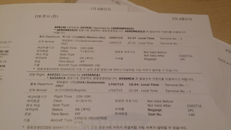 이게 바로 3장의 비행일정표(중 일부) 토요일 아침 7시 30분을 타고 과테말라에 토요일 밤 10시 30분 도착.ㅜㅜ )