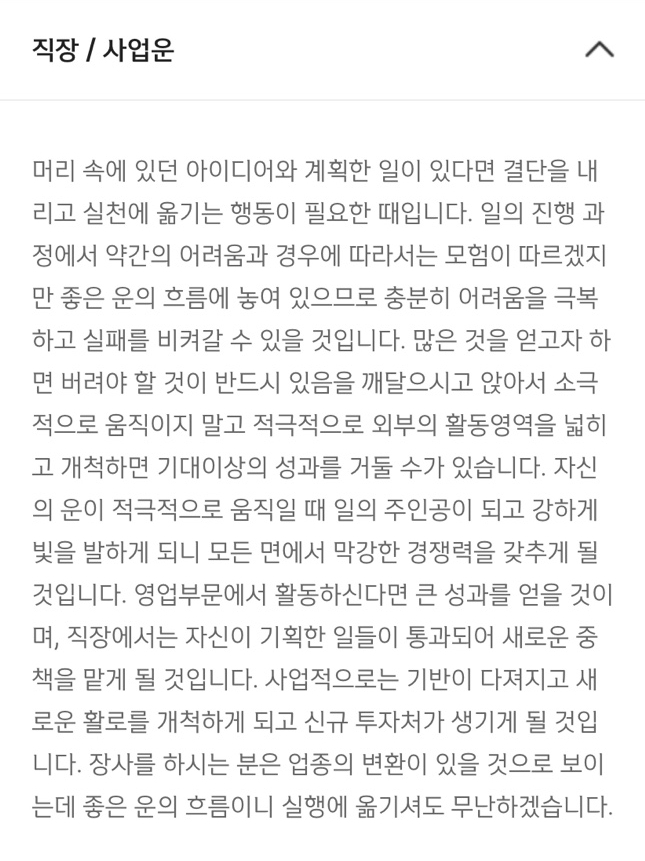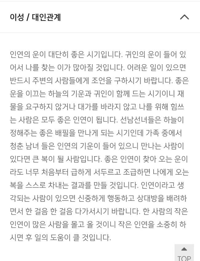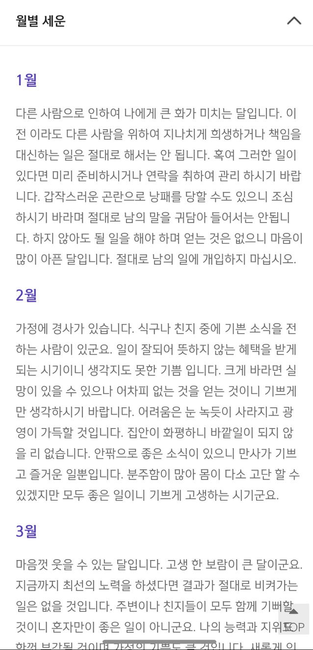 총론 재물운 직장 / 사업운 가정 / 건강운성 / 대인관계 월별 세운까지 자세히 알려준다.