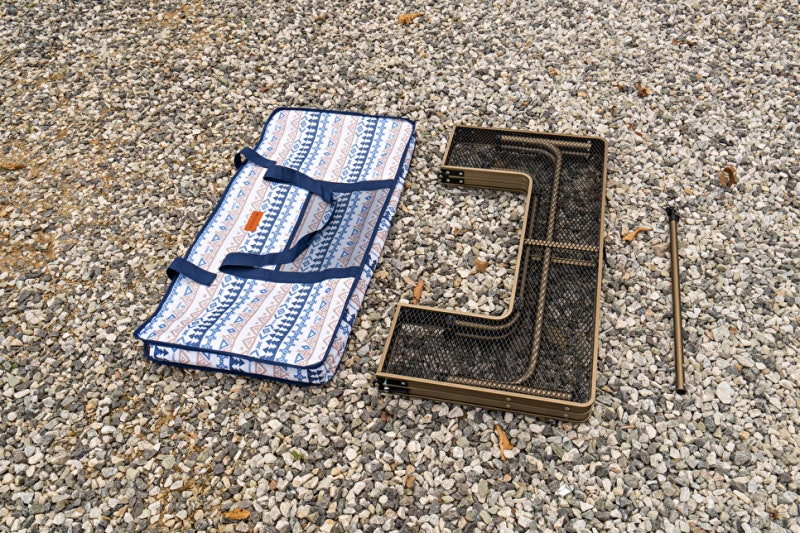 가방이 없는 상태에서 접은 상태는 90cm x 45cm x 6.5cm 크기로 보시는 것처럼 투폴딩 방식으로 설치가 매우 간단합니다. 게다가 테이블 상판이 아이언 메쉬 소재로 가볍기 때문에 굳이 파쇄석 바닥에 눕혀 설치할 필요 없이 저는 한 손으로 들고 있어도 설치가 가능했습니다.