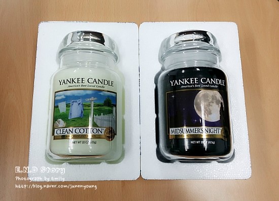 먼저 양쪽 양초를 소개하자면 왼쪽 노란색의 양키 양초가 홈 영감이고 오른쪽의 진한 네이비색이 미드서머 나이트입니다.