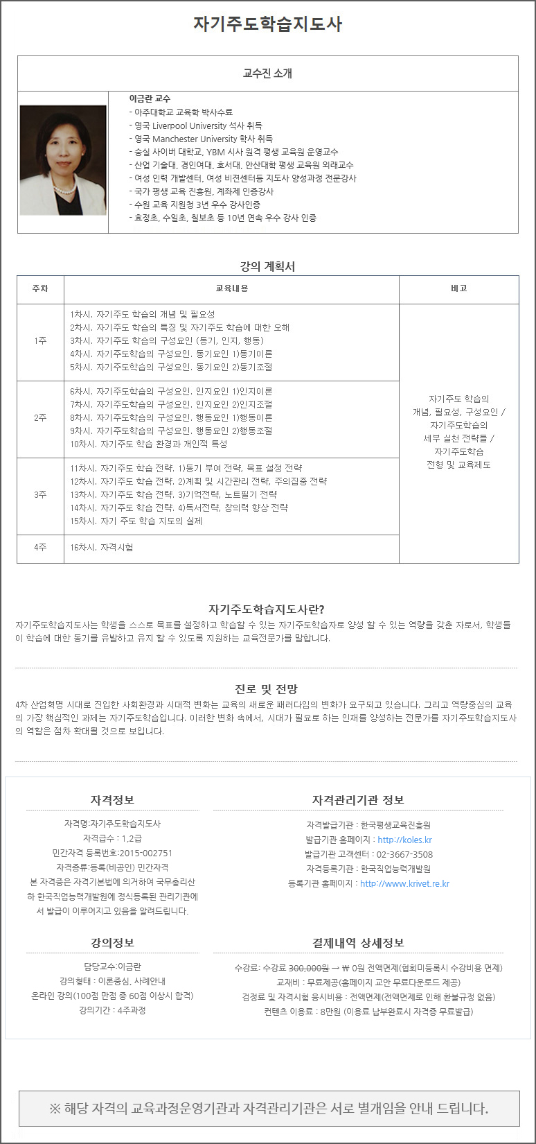 아무래도 시험공부를 하기 위해 학원 등을 가면 시간적인 것과 공간적인 제약도 있어서 여러모로 불편할 것 같았는데, 이것은 굳이 학습을 위해 움직이지 않아도 되고 온라인 강의로 시험 준비를 하고 취득도 가능해서 편했습니다.