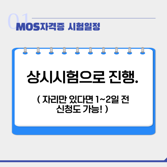 MOS자격시험은 상시 시험으로 이루어집니다.그러다 보면 매달 시험 일정과 시험장을 확인하고 지원할 수 있어요. 자리만 남아 있으면 최저 1일전에도 신청이 가능하기 때문에, 수험생의 기준, 준비가 되었을 때에, 곧바로 수험할 수 있다고 하는 메리트가 있습니다.