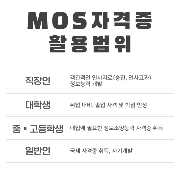 MOS자격증은 직장인의 경우 채용, 승진, 인사고과 등 객관적인 인사자료로 인정됨은 물론 정보능력 등 자기개발 목적으로도 많이 취득하고 있습니다.