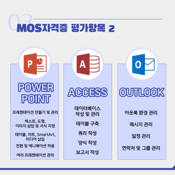 Microsoft Office Specialist의 약자이지만 말 그대로 마이크로소프트 오피스 프로그램의 활용능력을 인증하는 자격제도입니다. 워드, 엑셀, 파워포인트, 액세스, 아웃룩의 5가지 평가항목으로 구성되어 있는데요.