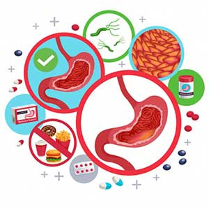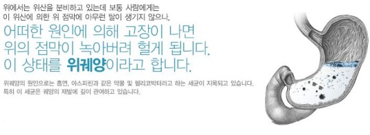 식도를 통과하여 위에 도착한 음식물은 위산에 의해 잘게 부서진 형태로 소장으로 진행되어 영양분에 흡수되므로 필연적으로 위산, 각종 소화효소, 담즙, 복용한 약물, 알코올 등 세포를 손상시키는 공격인자에 노출되어 있습니다. 이런 공격 요인에 대해서 생체 내에서 여러 단계의 방어 요인이 갖추어져 있는데 이런 공격과 방어의 균형이 깨질 때 위장의 점막이 손상되면서 궤양을 일으키게 됩니다.