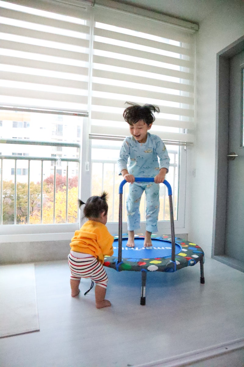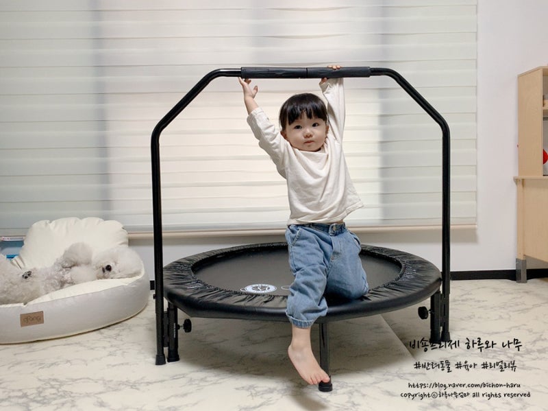 첫째 아이와 둘째 아이를 키워보면 상당히 다른 점이 있습니다.POWER!!!! 겨우 2살 넘은 남자애인데 저기서 뛰어와서 껴안기도 미리 무섭죠 😀 그만큼 에너지가 넘치니까 가끔은 힘없는 엄마가 감당할 수 없을 정도로 에너지가 넘칠 때가 많아요.접이식 1인용 트램펄린은 정리해서 우리 집도 2살 아이도 놀기 좋은 대형 사이즈의 유아 트램펄린을 준비했습니다.