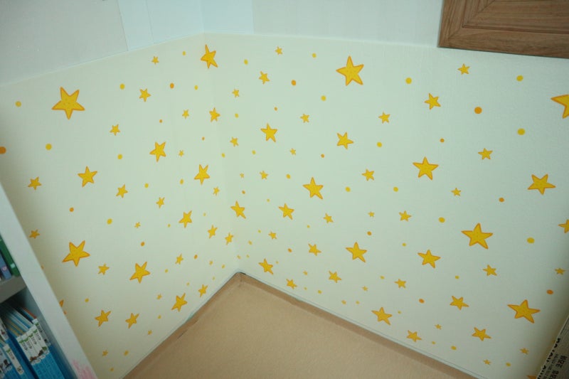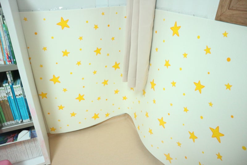 여기서 주의해야 할 것은 뒷면의 비닐을 떼어낸 뒤 바닥에 적당히 두면 안 된다는 것이다. 비닐에 부착된 접착제가 바닥에 닿으면 끈적이는 것이 완전히 부착된다 (´;ω;))접착제가 닿은 손은 흰 끈이 붙어 있고,비닐이 닿은 방바닥도 끈적끈적한 접착제가 눌어붙었다. 우와, 그것도 모르고 발로 밟아서 양말에 다 묻어서 난리가 났다는… 셀프 시공할 때는 이것만 주의하면 될 것 같아.벽의 3분의 1밖에 붙이지 않았는데 붙인 곳과 붙이지 않은 곳의 차이가 확연히 드러났다. 붙이지 않은 곳의 벽은 냉기가 쉴 새 없이 뿜어져 나왔지만 붙인 곳은 그저 따뜻했다.기존 벽지와 색깔 차이가 심해서 너무 이상하면 어쩌나 했는데 그렇게 나쁘지는 않을 것 같았다. 어차피 이쪽 벽은 커튼이 계속 쳐져 있어서 별로 상관없었는데…!옆으로 한번 켜보니 그 뒤부터는 속도가 붙어서 빠르게 나아갔다. 질질 끌어서 재빠르게 붙였더니 2분도 안 걸린 것 같아.처음에는 그래도 성의를 보여서 가위로 잘랐는데 이번에는 칼로 대충 싹싹…!가운데가 애매하게 남았어. 이럴 줄 알면 왼쪽 벽 붙이고 가운데 붙이고 오른쪽 벽 붙이는데… 어차피 오른쪽은 커튼이 쭉 있는 자리라서 조각해도 안 보이는데…후…어쩔 수 없이 남은 부분만 잘라 맞추기로 했다.위쪽만 살짝 끼워보고 확 넣은 것 같은 느낌이 드는지 한번 확인해봤는데 왜! 눈에 잘 띄지 않는 것이다.그래서 안심하고 꽉꽉 채웠다.빈자리에 맞춰 넣은 뒤 모습~~!! 물론 가까이서 보면 눈에 띄지만 멀리서 보면 그냥 하나의 벽지로 보여서 너무 만족스러워 :^)침대를 끌어내고 접착식 단열벽지를 붙이고 침대를 다시 원상복귀시키기까지 총 10분이 채 걸리지 않았다.구축 아파트라 벽이 반듯하지 않고 표면이 울퉁불퉁한데다 창문이 있는 분들은 100% 완벽하지 않아 틈새가 살짝 보이는데 이 정도면 괜찮을 것 같아요:^)프리미엄 두께로 10m 주문해서 2만원 정도 나왔고 제 시간 10분 투자로 인해서 외풍이 불고 추운 아이 방이 따뜻해져서 너무 좋은 월동 준비가 아닌가 싶다.
