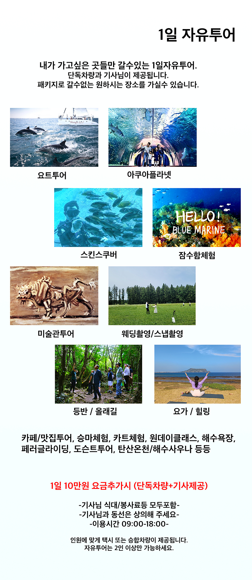 제주도 단체여행을 준비하는데 가장 고민되는 부분은 이동수단이 아닐까 생각합니다.렌트를 하는데 몇 대의 차가 필요한지, 운전은 누가 해야 하는지 여러 가지 문제가 생길 수 있는데 다 같이 즐기려고 떠나는 단체여행인데 따로 다니면 무슨 의미가 있을까요!여행도 다 같이 가야 재밌어요.그럴 때는 제주도 미니버스 투어 패키지로 여행해보세요.운전자가 포함된 차량 전세 서비스로 안전하게 운전할 수 있고 가이드도 함께하기 때문에 편안하게 여행을 즐길 수 있습니다.편하게 운전을 맡기고 고객님은 오로지 여행에만 집중하세요.단체여행이라 일정이나 관광지 코스 맛집 등 계획하기가 쉽지 않습니다.하지만 그럴 때도 제주도 양 기사가 도와줍니다.제주도 여행을 하면서 필요한 부분을 도와드리는 것에 설레고 행복한 여행을 준비하실 수 있으리라 생각합니다.제주 단체여행 오신 손님이었어요.제주도 미니버스 투어로 여행을 하셨는데 원래는 자차 렌트를 하려고 했는데 막상 빌리면 인원도 많고 운전을 누가 해야 할지 걱정된다고 하셨어요.여행하면서 운전하는 게 생각보다 힘들고 부담스러웠고 얼마나 피곤했는지 알 수 있어서 문의를 해주셨어요.그래도 여행은 포기할 수 없는 일!! 여러 여행사를 알아보고 있는데 제주도민 양기사님께 연락을 주신 것입니다.그렇게 제주도 미니버스투어 패키지를 이용하셔서 여행은 100% 자유여행으로 진행되었습니다.여행 오기 전 제주도민 양 기사님과 함께 상의하고 스케줄 조정을 하고 코스를 이동 동선에 맞게 알차게 계획해 왔습니다.제주도 미니버스 투어를 이용한다고 해서 이미 정해진 일정으로 여행하시는 것은 아닙니다.자유여행이 가능해서 만족도가 높았어요.직접 여행코스를 계획하셔도 되고 기사님의 도움을 받아 여행코스와 맛집을 계획하셔도 됩니다.제주도 민양기사는 현지 제주도민으로 길을 잘 알기 때문에 동선을 잘 파악하고 있으며 일정을 알차고 알차게 계획하고 있습니다.여행지 추천과 맛집 추천까지 정말 맛있는 곳에서 알려줘서 만족하는 분들이 많았어요.힘들일 없이 운전하지 않아서 다음 제주여행에서도 재사용하시는 분들이 많았다고 합니다.제주도 미니버스 투어를 이용하실 분들은 공항에서 직접 픽업해드리고 있으며 렌트업체까지 이동하여 차량을 수거 반납하는 과정은 없습니다.렌트하시는 분들은 차를 인수하셔서 반납하는 시간이 1시간 이상 걸릴 수도 있지만 그런 과정이 생략되기 때문에 시간도 절약이 됩니다.공항에 도착하는 시간에 맞춰 픽업하고 마지막 날도 공항까지 시간에 맞춰 안전하게 모셔다 드리니 시간에 쫓기듯 여행하는 일도 없습니다.다른 여행객의 차량을 인수하여 반납할 때 제주도 미니버스 투어를 이용하시는 분들은 좋은 명소 한 곳이라도 더 방문하실 수 있습니다.현지 기사님이 운전해주시니 내비게이션의 도움 없이 길을 잘 찾아 한꺼번에 목적지까지 안내하고 있습니다.렌트로 직접 운전할 때는 길을 잃는 경험도 있겠지만 제주도 미니버스 투어는 그런 시간을 낭비하지 않습니다.짧은 3박 4일 일정으로 오신 분들도 알차고 알찬 여행으로 일주일을 여행한 것 같은 기분이라며 제주도 구석구석을 둘러볼 수 있어서 매우 만족도가 높았습니다.관광코스를 다 소화하고 남은 시간이 있어서 그 근처 여행지를 다녀오곤 했어요.제주의 숨은 명소도 추천합니다.제주에 이런 곳이 있었냐면서 숨은 비경에 감탄하면서 독특한 제주여행을 하신 것 같다고도 합니다.그리고 그곳을 배경으로 단체사진도 많이 찍어주고 있습니다.단체여행에서 빼놓을 수 없는 사진도 기사님이 많이 찍어드릴게요.사설관광지에서는 할인혜택을 제공하고 있어 현장에서 바로 저렴하게 입장권을 구입할 수 있지만 제주도 버스투어 패키지를 이용하시면 운전은 물론 여행코스 맛집, 입장권 할인, 사진까지 찍고 있습니다.오직 여행에만 집중할 수 있도록 돕고 있어 만족스러운 여행이 될 것입니다.미니버스는 25인승으로 단체여행을 하시는 분들이 많이 오십니다.그 외 차량은 카니발, 승합차, 쏠라티도 준비되어 있습니다.여행할 인원수에 맞게 차를 선택해서 여행하세요.미니버스는 25인승으로 단체여행을 하시는 분들이 많이 오십니다.그 외 차량은 카니발, 승합차, 쏠라티도 준비되어 있습니다.여행할 인원수에 맞게 차를 선택해서 여행하세요.미니버스는 25인승으로 단체여행을 하시는 분들이 많이 오십니다.그 외 차량은 카니발, 승합차, 쏠라티도 준비되어 있습니다.여행할 인원수에 맞게 차를 선택해서 여행하세요.차는 매일 깨끗하게 관리하고 있으니 여행 중에 쾌적한 환경에서 여행하세요!자세한 문의는 아래 번호로 연락주시면 자세하고 친절하게 상담해드리고 있으니 언제든 연락주세요. ^ ^제주도민양기사 tel : 010-8401-8120