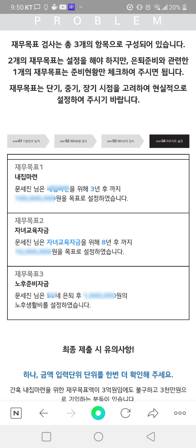 먼저 기본 정보를 입력하고 재무 유형을 검사하고 재무 상태 검사 마지막에 재무 목표를 설정합니다.