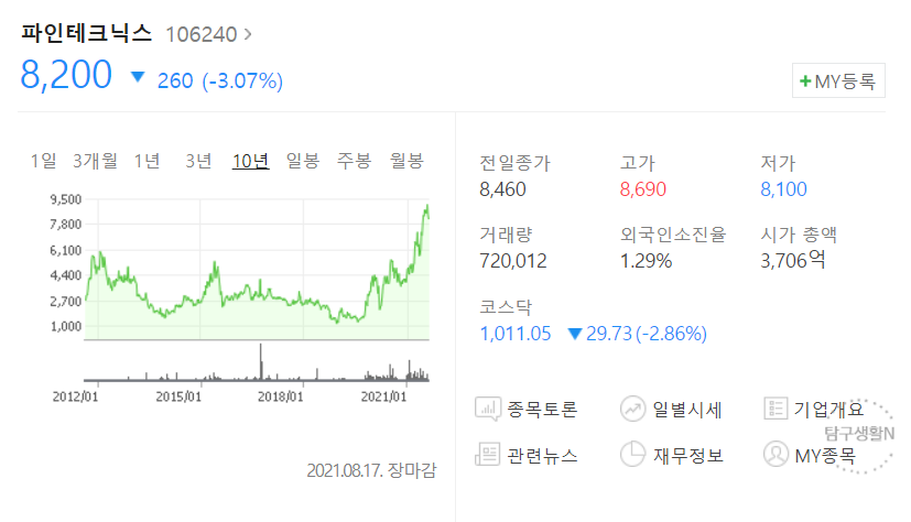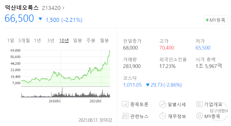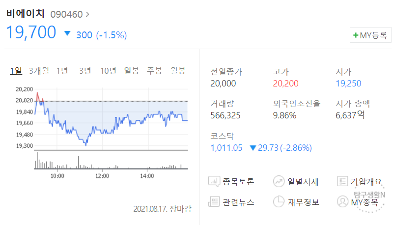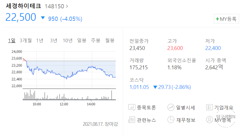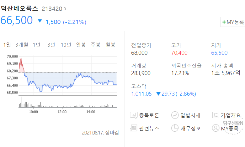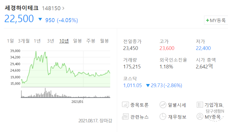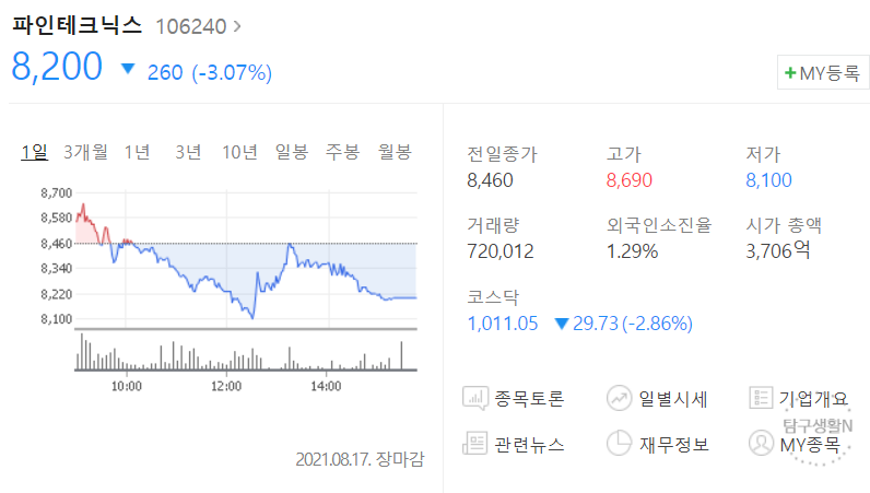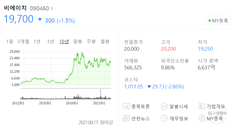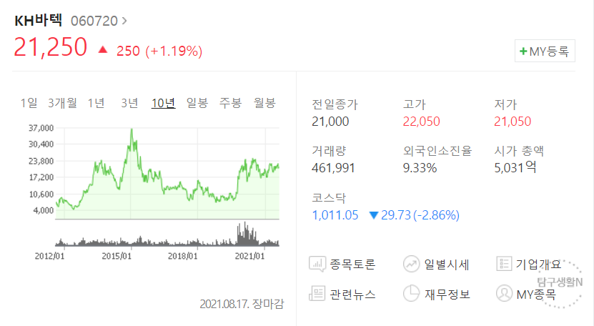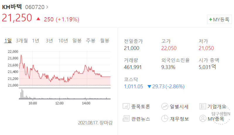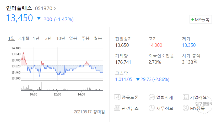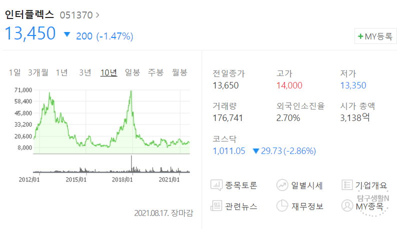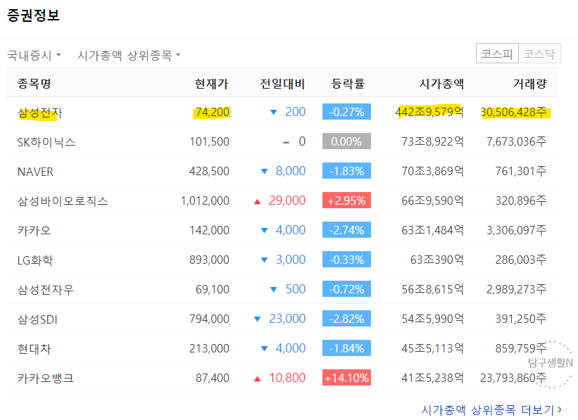개인투자자분들의 걱정을 덜어드리기 위해 포스팅은 증권가에서 바라보는 긍정적인 시선에 대해 이야기하고 싶었습니다. 삼성전자가 국내 주식시장에 대한 의존도도 감소하고 있습니다. 이 얘기는 한 종목이나 업종 쏠림 현상이 지나치면 지금처럼 국내 증시에 타격이 커집니다. 이러한 변동성을 줄이는 동시에 다양한 종목과 업종으로 자금이 분산되는 효과가 있고 오히려 좋은 점도 있다고 합니다.” 아래 증권정보는 2021년 8월 17일 현재 시가총액입니다. 시가총액을 보면, 1위와 2위 종목간에 시가총액 차이가 크게 나고 있음을 알 수 있습니다.