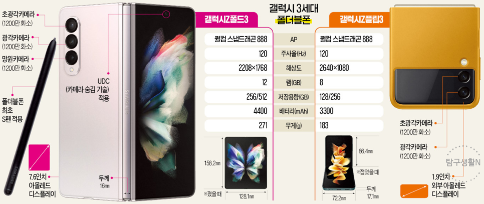 이번에 공개한 신작은 도대체 어떻게 했을까요? 주요 특징을 요약하면 아래 그림과 같습니다. 갤럭시 3세대 갤럭시Z폴드3에서는 S펜이 들어있는 부분과 UDC라는 언더디스플레이 카메라[Under Display Camera]를 적용하여 노치없이 넓은 화면에서 디스플레이를 감상할 수 있게 되어 있었습니다.