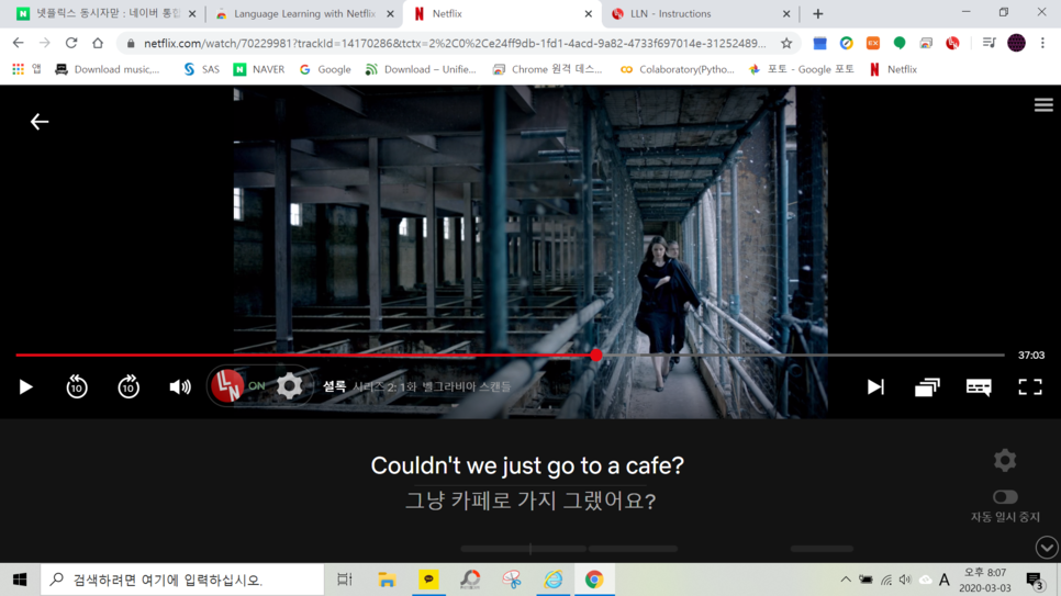 그러면, Netflix 동시 자막이 있는 영자막이 설정됩니다.대충 LLN(Language Learning with Netflix) 설명을 해드릴게요.