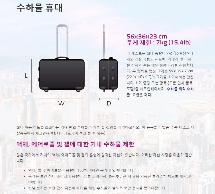 1.캐리어 혹은/누가봐도 큰가방 1개 사이즈:56x36x23cm 이내 중량:면세점에서 구매한 물건 포함 7kg이내 2.휴대용가방 1개 사이즈:40x25x20cm이내1.캐리어 혹은/누가봐도 큰가방 1개 사이즈:56x36x23cm 이내 중량:면세점에서 구매한 물건 포함 7kg이내 2.휴대용가방 1개 사이즈:40x25x20cm이내홍콩익스프레스 위탁수하물 기준크기 : L + W + H 종합 158cm 이내 무기 : 수하물 1개당 32kg 이내크기 : L + W + H 종합 158cm 이내 무기 : 수하물 1개당 32kg 이내캐리어 Luggage Case 구매 및 가격기내용 캐리어가 없어서 일단 인터넷 면세점을 구입한 뒤 여행 당일 찾아 그대로 사용하기로 했다.홍콩익스프레스(이하 ‘홍익’) 기내수하물 허용 크기는 36x23x56 한국 여행객들이 많이 이용하는 동남아 저가항공사 에어아시아에어이사, 비엣젯 기내수하물 기준 크기와 같다.구입하면 나중에 쓸 일이 있을 때 유용해.그래서 기내용 캐리어 20인치 아무거나 사면 될 줄 알았는데 여기서 또 문제가 있었어.아메리칸투어리스트, 샘소나이트, 만다리나덕, 리모와, 뚜레 등 브랜드 캐리어 제조사의 20인치 캐리어 크기가 저가항공사 기내수하물 기준과 1~2cm씩 차이가 났다.예를 들어 내가 구입하려고 했던 샘소나이트 Toiis/가로세로 모두 2~3cm 크다.이게 진짜 애매한 게 리뷰를 찾아보니까 누군가는 통과했어, 통과 안 했어, 좋아, 괜찮지 않아 이런 고민을 하는 사람들이 많은 것 같아.여행 준비 과정에서 하지 않았던 걱정을 조금이라도 해야 하고 신경 써야 하는 상황이 조금 짜증났다.지금이라도 위탁수하물 신청을 하고 52000원을 내면 기내수하물 규정이고 뭐고 신경쓰지 않아도 되지만 사실 조금 궁금한 게 더 컸다.해외여행 시 공항마다 차이는 있겠지만 항상 위탁수하물을 찾기 위해 짧게는 10분에서 길게는 1시간까지 기다려야 했고, 시간을 낭비한 경험에 비춰볼 때 그런 과정 없이 그냥 빠져나오면 얼마나 편리하고 빠르다고 느낄 수 있을지 궁금했다.만다리나덕 마카론 MXV14044 그래서 최대한 여행사 규정에 맞게 검색해서 구매한 것이 만다리나덕 마카론 가격은 인터넷 면세점 적립금을 받고 총 결제금액 12만원 정도 저가항공사가 요구하는 크기보다 조금 작은 35x22x53 사이즈!! 적혀있는 크기가 정확하다면 홍콩 익스프레스 비엣젯 에어아시아 등 저가항공 탑승시 유용할 것이다.총평기내 수하물 크기, 무게 때문에 몰랐던 규정도 알고 가방도 새로 생겼다.앞으로 3주 정도 남은 여행, 위탁수하물 없이 하는 여행이 너무 좋다면 몰라도 가급적 수화물은 위탁하는 게 낫지 않을까?갑자기 후회된다 귀찮아