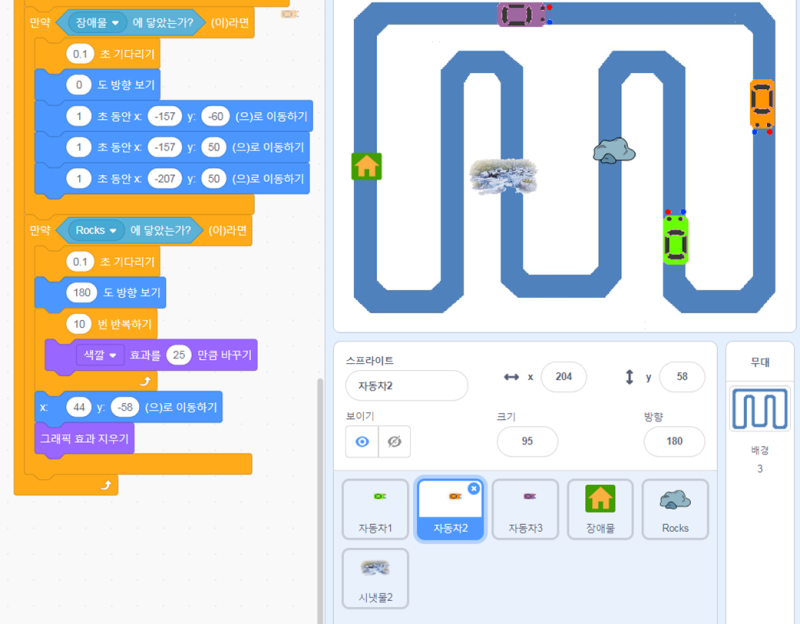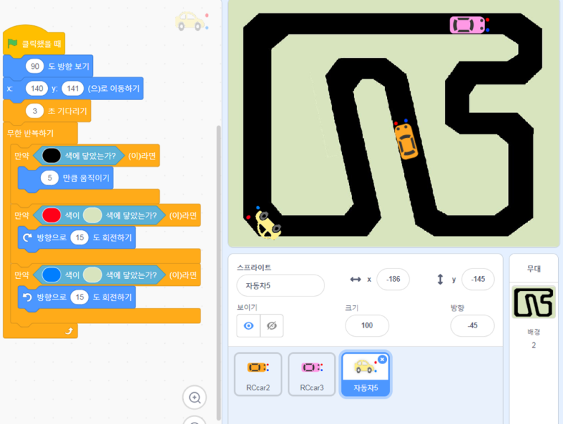 20221008 주간일기 스크래치 코딩 수업 4/15 자동차 드리이빙 + 자율 주행, 도넛을 잡아라