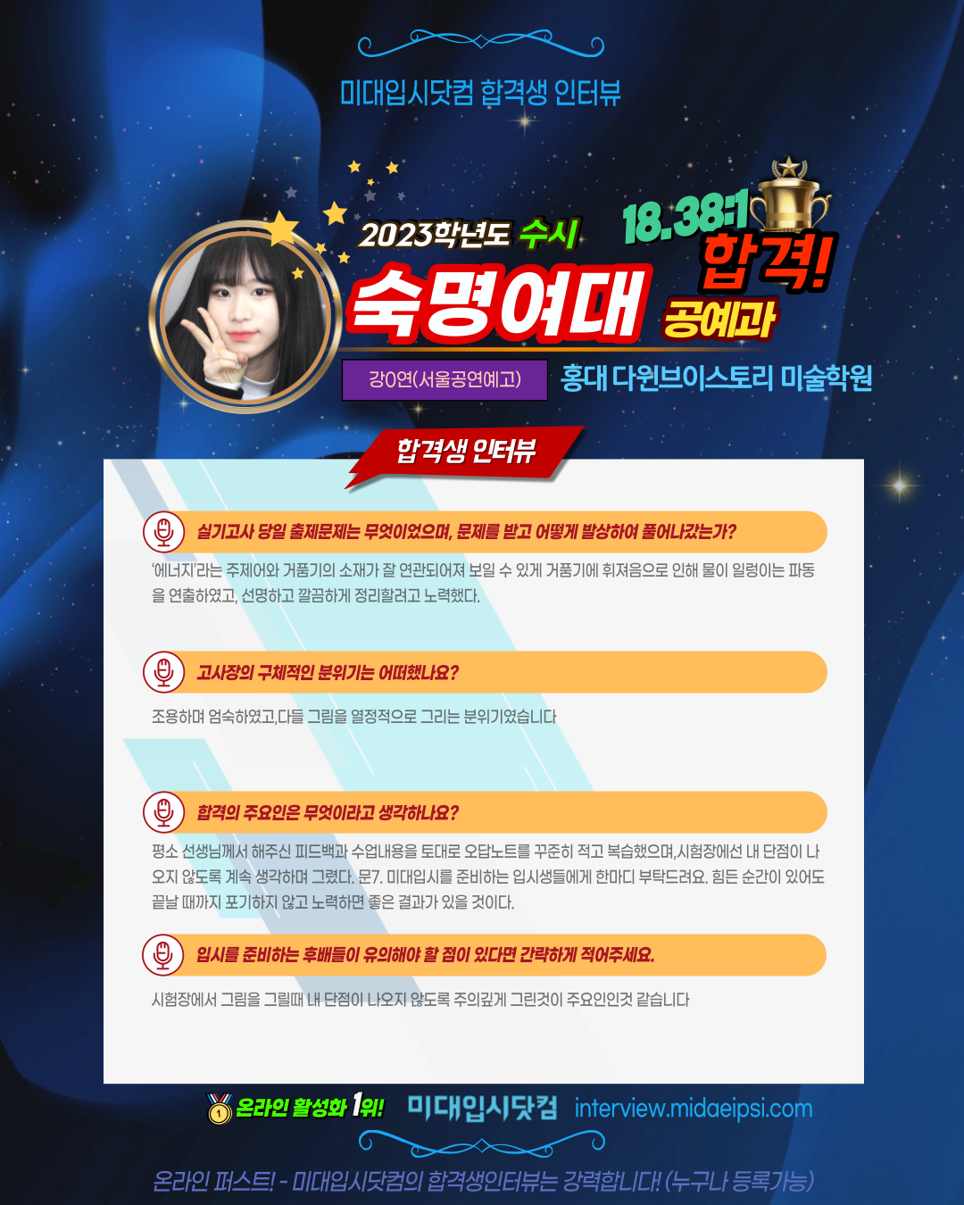 2023학년도 수시 숙명여대<합격생 인터뷰>[대구미술학원, 대구입시미술학원, 상인동미술학원, 달서구미술학원, 상인아이엠]