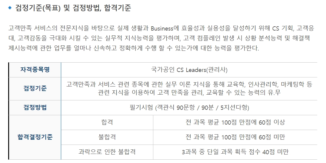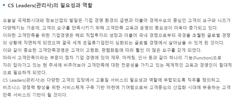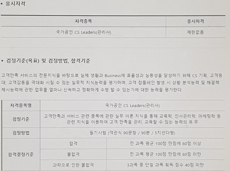 그렇기 때문에 공기업이나 각 기업에서도 CS 파트에 있거나 재직자분들의 승진이나 사고과를 앞두고 있을 때 플러스 점수를 받기에 유리한 자격증으로 사용됩니다.